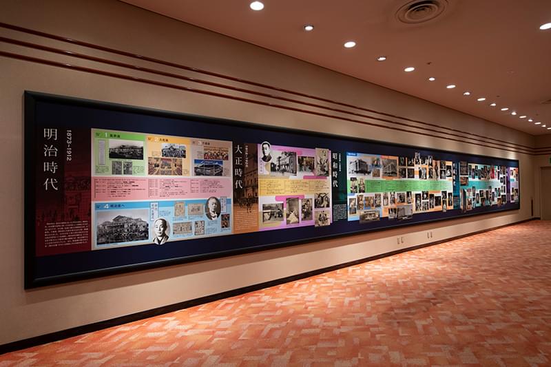 明治座の歴史を目で見てわかる形で残したいと、創業140周年を記念して制作した年表パネル。