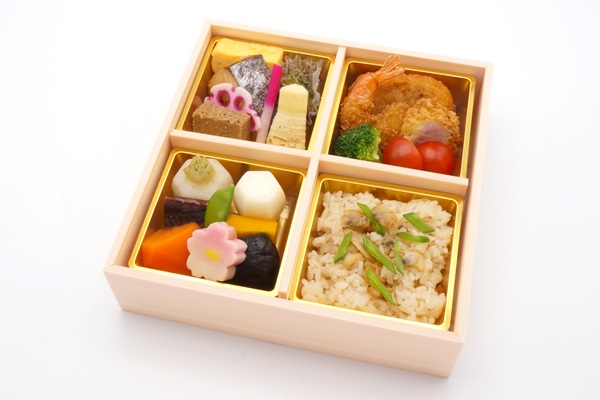 | お品書き | 鰈柚香焼き、玉子焼き、干し柿なます、鴨ロース、さつまいも甘露煮、一口昆布巻き、酢蓮根、はじかみ、ぜんまい篠田煮(ぜんまい・油揚げ)、ズッキーニ、人参、胡麻豆腐(栗・銀杏・クコの実・胡麻餡)、海老芋、かぼちゃ、豚角煮、しいたけ、百合根一口茶巾、青菜、浅利御飯(浅利・鮭ハラス・しめじ・スナップエンドウ) |