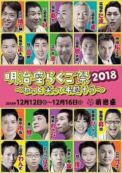 2018年12月12日(水)~16日(日)明治座らくご祭2018流派を超えて、次世代の落語家エースが大集合! 劇場内の食堂を会場に、 5日間限定でお届けする特別イベント。 終演後には打ち上げも実施します。(希望制)