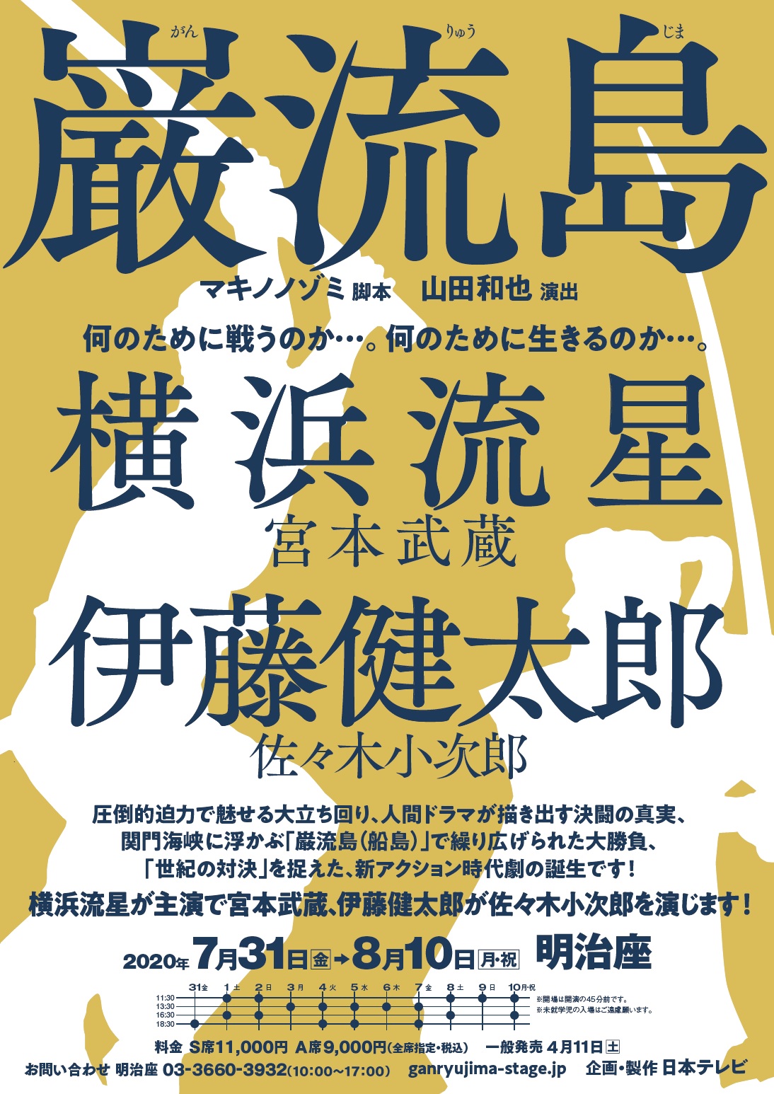 - 舞台「巌流島」東京・明治座公演のチケットは転売防止のため、「チケット不正転売禁止法」の対象となる「特定興行入場券」として販売を致します。