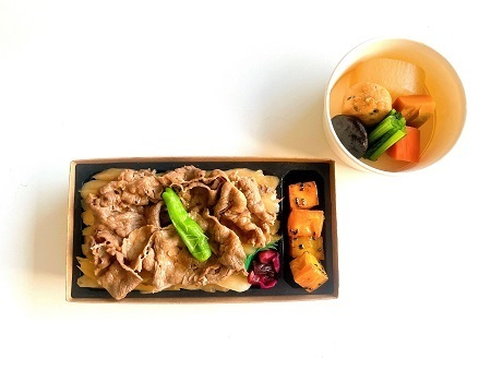 【お品書き】すき焼き重(牛ロース・牛蒡・獅子唐・御飯・京芝漬)、大学芋(サツマイモ・黒胡麻)、煮物(大根・がんも・南瓜・人参・小松菜・椎茸)