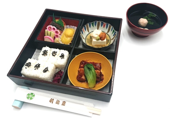 鮭西京焼き、伊達巻き、栗きんとん、花蓮根、赤蒲鉾、枝豆茶巾、胡瓜、胡麻豆腐、湯葉、うに、わさび、豚角煮、白髪ねぎ、糸唐辛子、青梗菜、黒ごま俵ご飯、香の物、お吸物