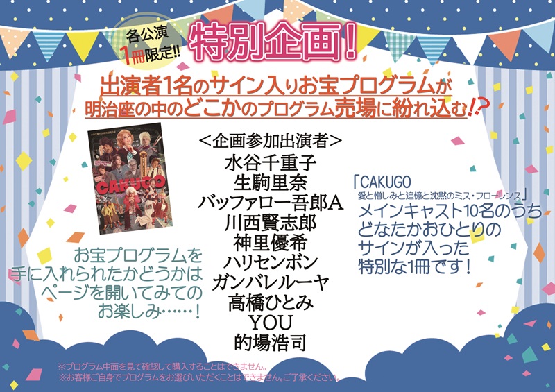 当日は、第一部「CAKUGO (カクゴ) 愛と憎しみと追憶と沈黙のミス・フローレンス」の笑いと涙と驚きと興奮の物語について、キャストが意気込みを存分に披露すると同時に、水谷千重子による歌唱披露も予定しております。