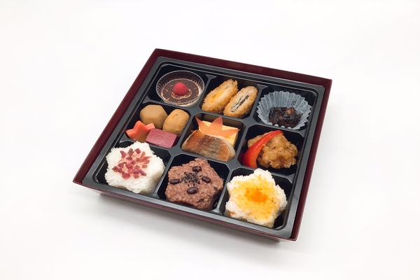 赤魚漬け焼き、玉子焼き、唐揚げの油淋鶏ソースがけ、赤パプリカ素揚げ、ミルフィーユカツ (チーズ、大葉)、炊き合わせ(里芋、がんもどき、花麩、赤蒟蒻)、海苔豆、梅御飯、赤飯、ちらし小花ご飯(錦糸玉子、とびっこ)、ティラミスのラズベリー乗せ