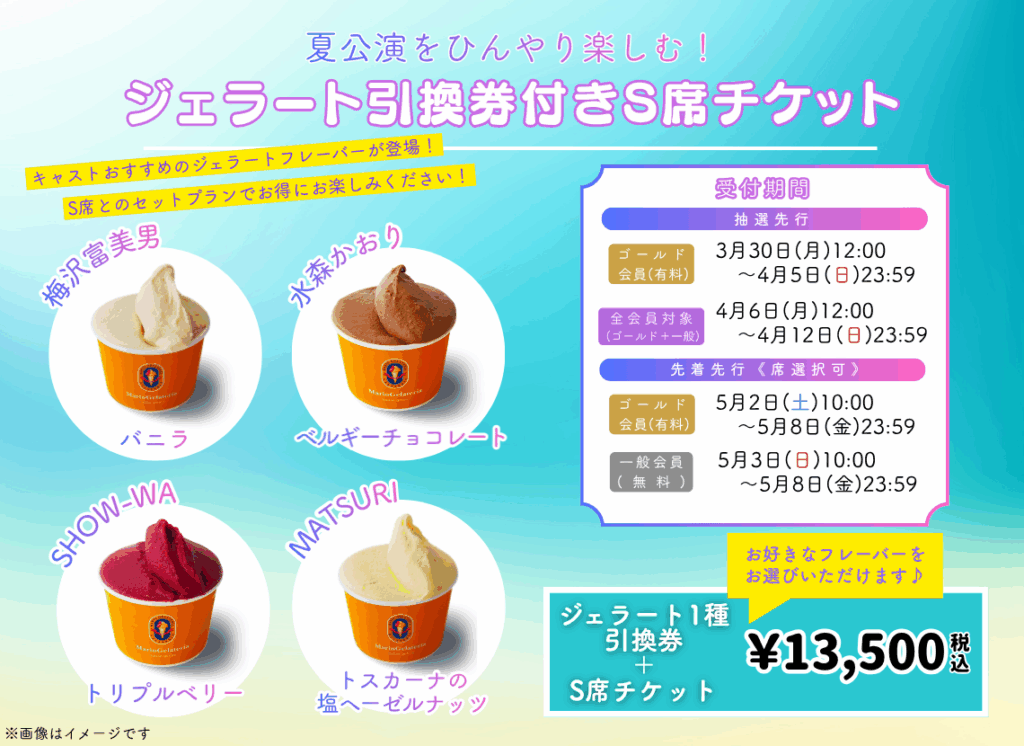 公演期間中、キャストおすすめのジェラートフレーバーが登場!明治座FAN倶楽部では、S席と一緒にお得に楽しめるセットプランをご用意しました。