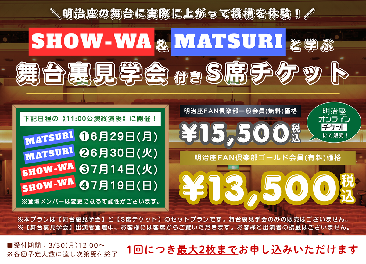 ※車いすスペース(S席)でのご観劇をご希望される方は、一般販売日以降、明治座チケットセンター(03-3666-6666)へご連絡ください。