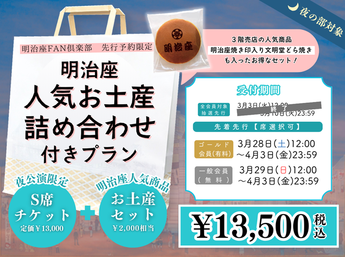 17:00開演の部限定で、S席チケットと明治座売店で人気のお土産詰め合わせがセットになったお得なプランが登場!