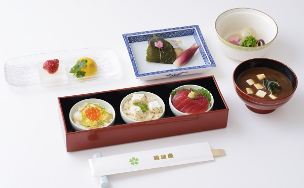 「春告げ魚」と言われる旬魚鰆の西京焼き桜葉包みと、蕨や菜の花を添えた蓮根饅頭などを、見た目にも華やかな鮪・鯛・いくらの3種丼とあわせました。春の味覚を存分にお楽しみ下さい。