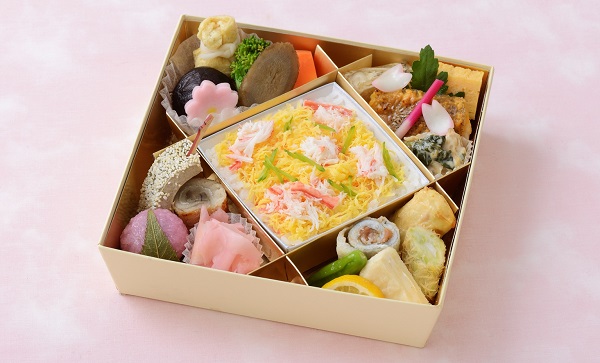 玉子焼き・サーモン西京焼き・とらふぐの煮凍り・浅蜊のごまサラダ・蓮根磯辺揚げ・鱧梅肉大葉巻き・白魚アスパラカダイフ揚げ・薩摩芋の挟み揚げ・獅子唐・野菜茶巾・菜の花・人参・牛蒡・椎茸・花麩・抹茶田楽串・小鯛の八幡巻き・桜花餅・蟹の散らし飯・ガリ