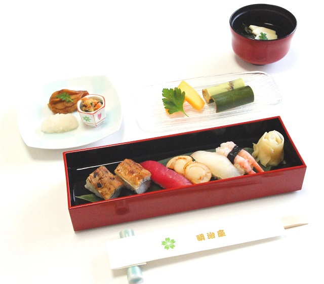 | お品書き : | 鮎魚女照り焼きの柚おろし添え・野菜の合い混ぜ・握り寿司(うなぎの小袖寿司 まぐろ 帆立 鯛 甘エビ)・若竹椀・甘味(あずき抹茶の青竹筒 パパイヤ) |