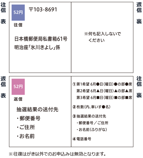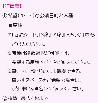 きよシートは一公演のみ承ります。なお、きよシートは大変高い倍率が予想されるため、第2、第3希望もお選びください。
