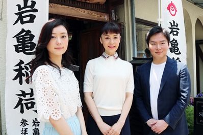 主演の大地真央、浜中文一、中島亜梨沙、そして潤色・演出を務める原田諒が、岩亀楼ゆかりの地「岩亀稲荷」を参拝しました。