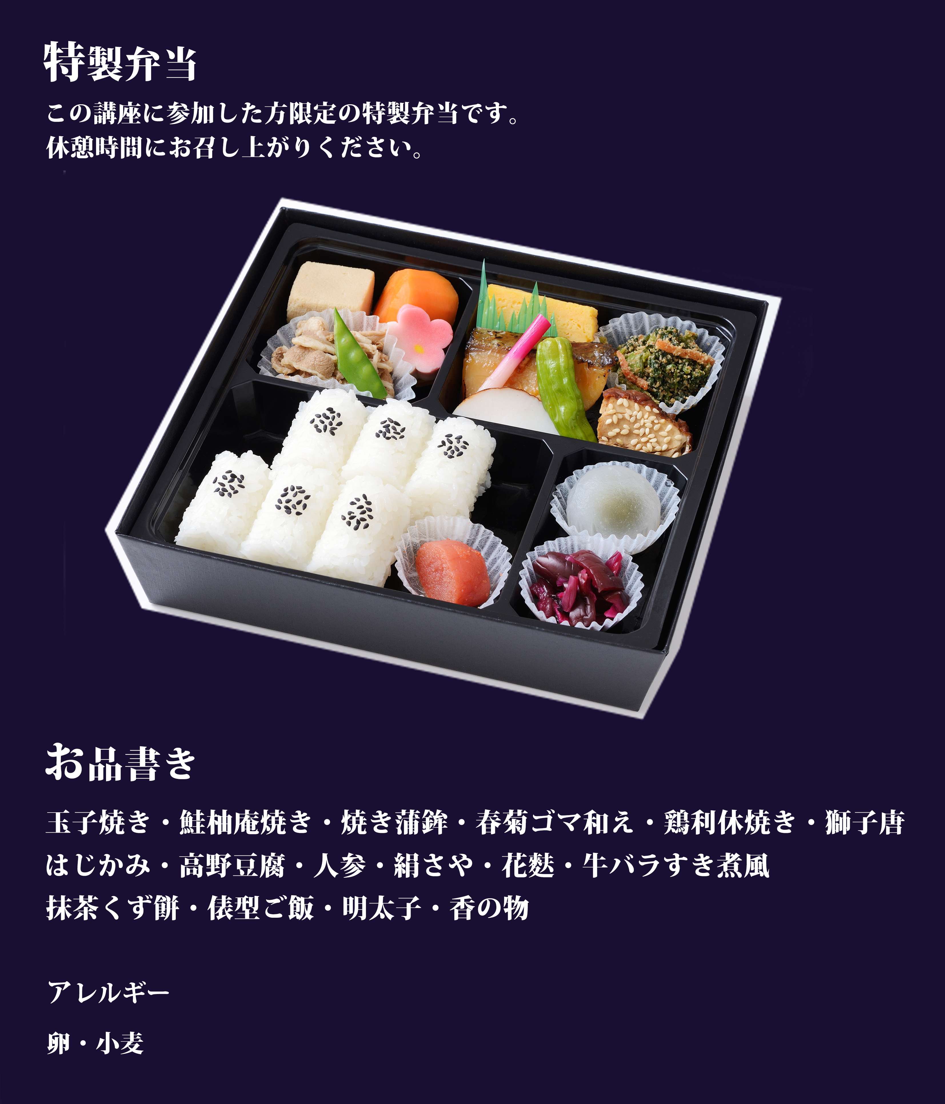 休憩時間にお召し上がりいただける特製折詰弁当つき。