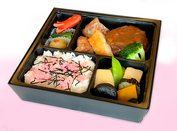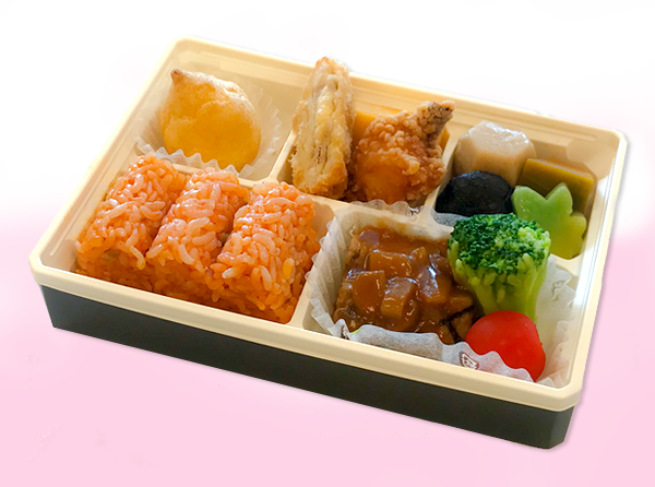 チキンライス、ミニハンバーグ、和風唐揚げ、ミルフィーユカツ(チーズ)、玉子焼き、ブロッコリー、ミニトマト、里芋、南京、椎茸、花麩、ミニシュークリーム