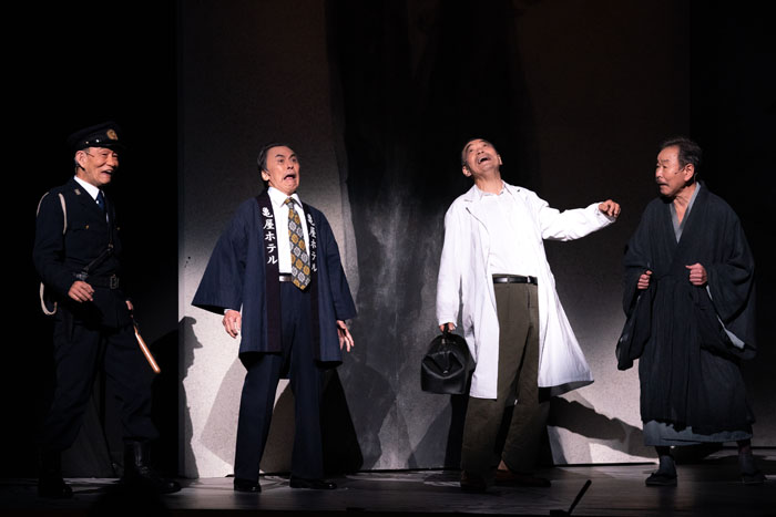 左から、ラサール石井(演出)、笹野高史、柄本明、花總まり、佐藤B作