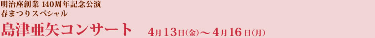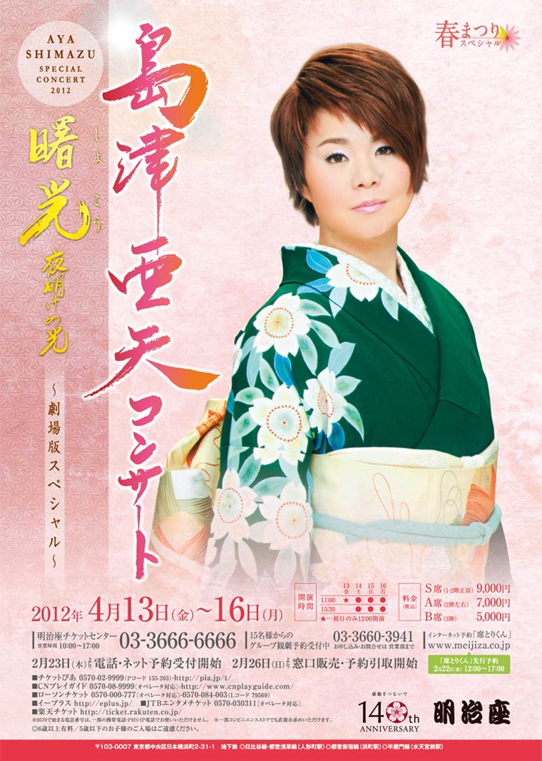 明治座創業140周年記念 春まつりスペシャル 島津亜矢コンサート 曙光 夜明けの光 ~劇場版スペシャル~ ”えん歌の申し子”と称される歌唱力の持ち主、島津亜矢。心に迫るあの歌声が、再び明治座に響きます! 最新情報 2011年12月31日島津亜矢公演特設サイトアップしました。