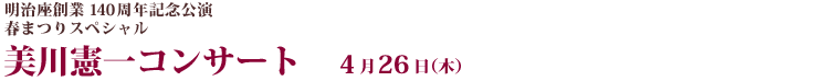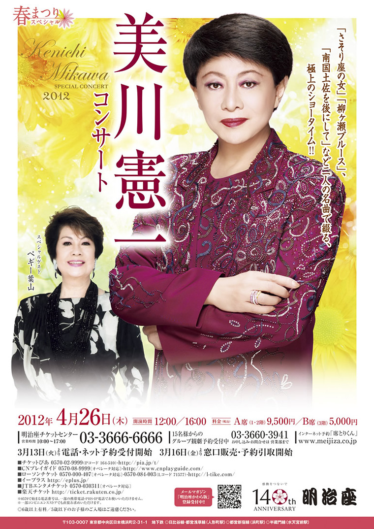 明治座創業140周年記念 春まつりスペシャル 美川憲一コンサート 「さそり座の女」「柳ヶ瀬ブルース」、「南国土佐を後にして」など 二人の名曲で綴る、極上のショータイム!! 最新情報 2012年04月16日「美川憲一コンサート」特設サイトアップしました!