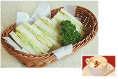 森のバターと称されるアボカドのクリーミーなサンドウィッチです。秘伝のお肌つるつるカフェ・オ・レ付