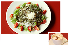 温泉玉子としらすの絶妙なハーモニーのパスタです。秘伝のお肌つるつるカフェ・オ・レ付