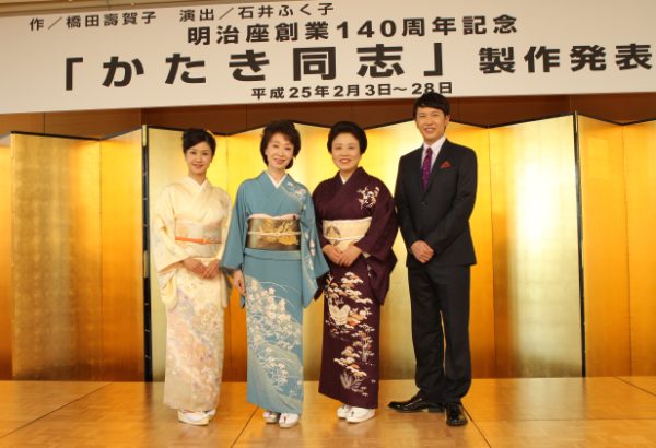 橋田先生の作品はNHK『おんなは度胸』に出演させて頂きましたが、この作品で“藤山直美という役者”を多くの方に知っていただきました。また父が亡くなりまして途方にくれている時に、芝居をやってみないかと声を掛けてくれたのが石井先生でした。そして、テレビでの仕事が落ち着きました時に、『また舞台をやりましょうよ』と声を掛けてくださったのが、三田さんでした。本当にお世話になった方々に囲まれてのこの舞台に立てること、本当に感謝の気持ちでいっぱいです。コツコツと努力をし、お客様に喜んで頂くことで感謝に変えさせて頂ければと思っております。 - ◇三田佳子 (お鶴役)