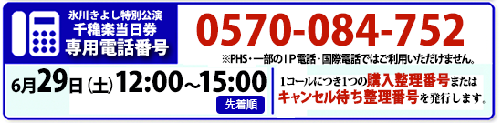 千穐楽前日の6月29日に専用電話で「購入整理番号」と「キャンセル待ち整理番号」の電話受付を行います。
