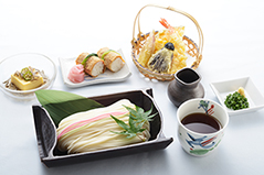 夏の風物詩涼しげな冷や麦に、サクサクの天ぷらと一口サイズで愛らしい信田寿司のさっぱりとした「冷や麦御膳」です。