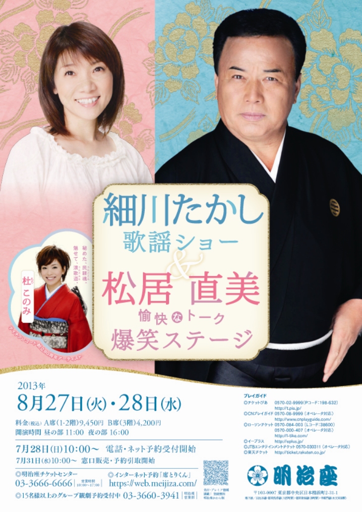 細川たかし・松居直美 最新情報 2013年7月17日お薦め商品ページをアップしました。 2013年7月16日9月「石川さゆり特別公演」との2公演セットプランを掲載しました。 2013年7月15日メディアページを更新しました! 2013年6月5日「細川たかし・松居直美公演」特設サイトアップしました