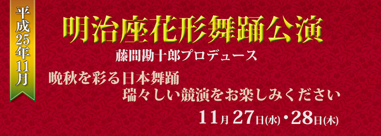 明治座 花形舞踊公演 舞踊家と歌舞伎俳優の華やかな競演 最新情報 2013年10月24日お薦め商品ページをアップしました。 2013年10月11日「2日間通し券」発売決定! 2013年09月26日出演者ページをアップしました。 2013年09月19日演目と配役をアップしました。 2013年09月19日チラシ画像アップしました。 2013年09月09日特設サイトアップしました!