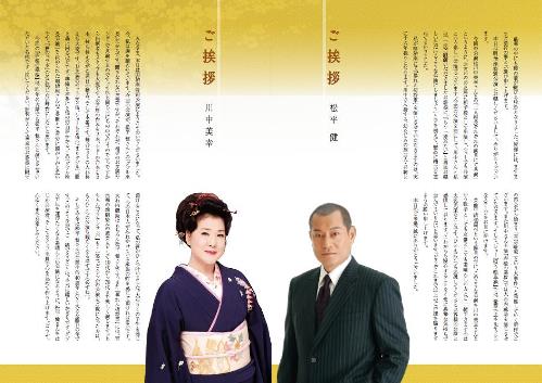 公演プログラム 二人座長それぞれの演目にて共演!! 公演プログラム 松平健 川中美幸 特別公演プログラム 定価 1,500円(税込) A4サイズ・全60ページ ・あらすじ/出演者紹介 ・スペシャルインタビュー 「座長・松平健が語る」 「座長・川中美幸が語る」 ・稽古場写真 などなど、見どころいっぱいです! 劇場内にて好評発売中! 気になる中身を少しだけ、ご紹介・・・