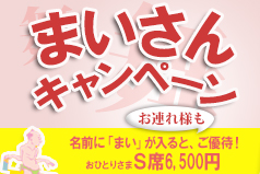 お名前(名字も可)に「まい」の文字が入る方とお連れ様が対象です。 お電話でご予約後、明治座切符売場でお引き取りの際、お名前を証明できるもの(免許証、保険証等の身分証明証)をご提示ください。 ※対象となるお名前の例:まい、まいこ、いまい、たまい、マイケル |