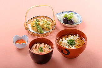 9月は秋の味覚の代表格「鮭といくらの親子ご飯」と四国の讃岐うどん、名古屋のきしめんとともに、日本三銘うどんの一つとして知られる稲庭うどんをサクサク香ばしい歯触りのかき揚げと共に御膳に致しました。あわせて初秋の旬果「巨峰と梨」をお楽しみください。