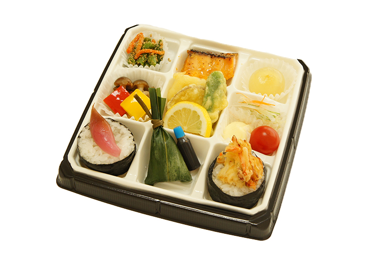 針打ち野菜・ミニトマト・茗荷寿司・野菜かき揚げの天むす・山菜おこわ・みかんゼリー