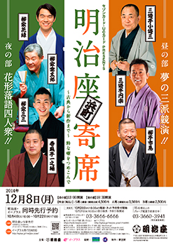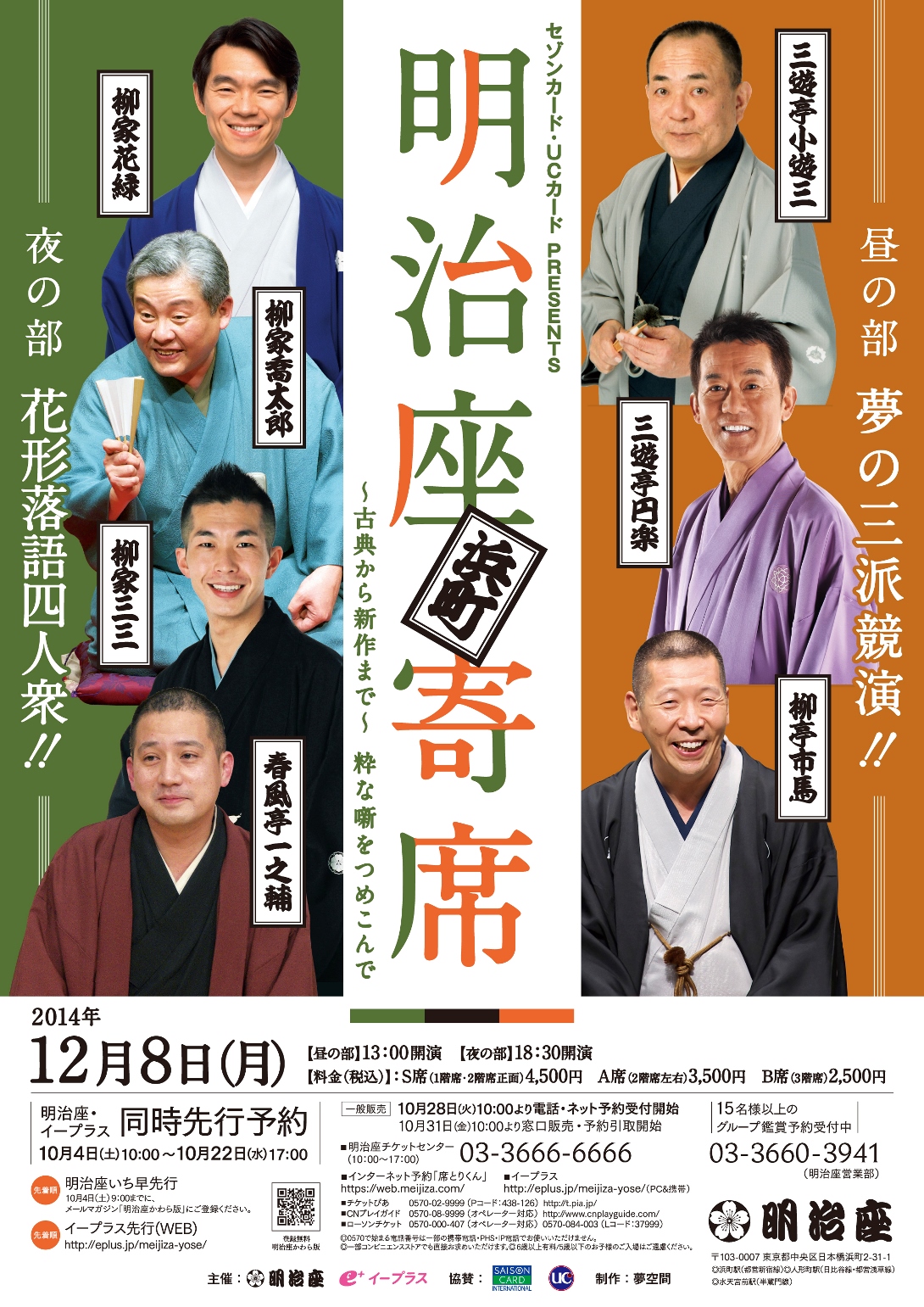 チラシ画像ダウンロード 落語会を牽引する三派競演の昼の部!続いて次代を担う花形四者競演の夜の部!共に豪華顔ぶれでお贈りする一日限りの浜町寄席~古典から新作まで、何が飛び出すか!?ご期待ください!! 主催:明治座 イープラス チラシ画像ダウンロード