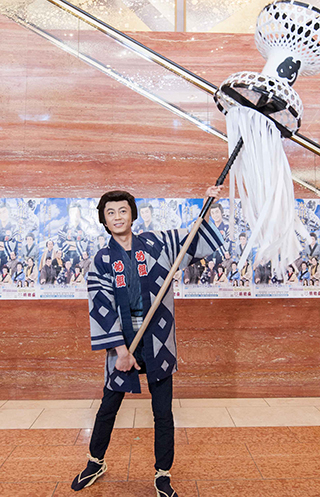 この日、氷川きよしは辰五郎に扮し、纏を振る姿を報道陣の皆様に披露いたしました。