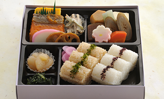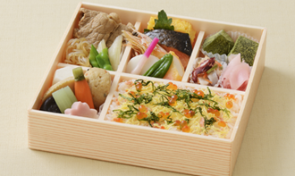 鮭柚庵焼き・玉子焼き・海老若草焼き・白小袖蒲鉾・蟹すり身揚げ・牛すき・蛸マリネ・抹茶わらび餅・里芋・がんも・たけのこ・細根人参・蕗・椎茸・花麩・鮭の親子飯