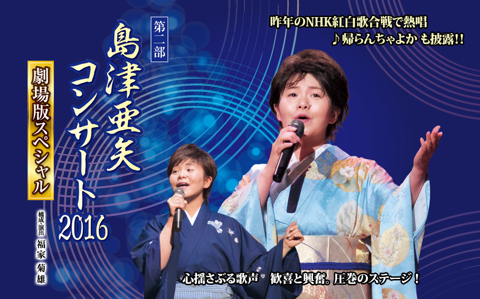 島津亜矢特別公演 こちらの公演は終了いたしました 動画・舞台写真 更新情報 2015年07月21日 スペシャルページに動画・舞台写真を公開 2015年05月13日 おすすめ商品ページを公開しました。 2016年04月05日 特設サイト公開しました。 キャスト〔第一部〕 島津亜矢 左とん平 穂積隆信 橋爪淳 おりも政夫 山田スミ子 奈良富士子 田口計 公演内容