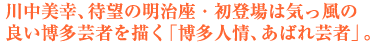 博多芸者の面子をかけて奔走する信吉を、川中美幸が生き生きと演じます。