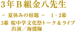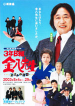 2003年8月公演 3年B組金八先生 出演:武田鉄矢 淡島千景 石倉三郎 細川ふみえ 茅島成美 森田順平 鈴木正幸 五十畑迅人 渡辺卓 倉沢桃子 中尾明慶 高松いく 他 高原で避暑? 海辺でリゾート? いえいえ、我らが金八先生の今年の夏は特別授業なのです。 それも万引きをしてしまった少年少女と、強欲な商店主・トメさんが生徒。 歳も価値観も違う個性的な生徒達に、金八先生の教えは伝わるのでしょうか?? 舞台初登場!!「3年B組金八先生」世代を超えて見て欲しい、心温まる舞台です。