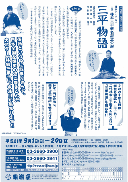 「昭和の爆笑王」「神風タレント」の異名をほしいままにした稀代の落語家・林家三平。その名跡が約三十年ぶりに次男・いっ平の「二代林家三平」襲名によって蘇ります。襲名披露のスタートは2009年3月。明治座ではその同じ月に記念公演として「三平物語」を上演致します。