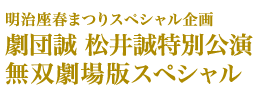 2009年4月公演 明治座春まつりスペシャル企画 劇団誠 松井誠特別公演 無双劇場版スペシャル 一、沓掛時次郎 二、爆笑喜劇 「誠の意地悪バアさんVS唄子の新妻」 三、誠版レビュー 「華・艶・舞 桜吹雪七変化」 出演:松井 誠 京 唄子 江藤 潤 丹羽貞仁 他
