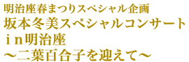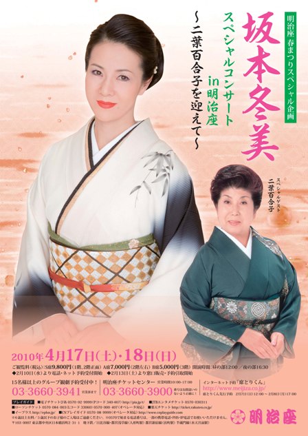 2010年4月公演 明治座春まつりスペシャル企画坂本冬美スペシャルコンサートin明治座~二葉百合子を迎えて~ 昨年、7年ぶりの明治座登場を果たした坂本冬美。 敬愛する二葉百合子をゲストに迎え、大絶賛を博したスペシャルコンサートを、 装いも新たにお届けします。