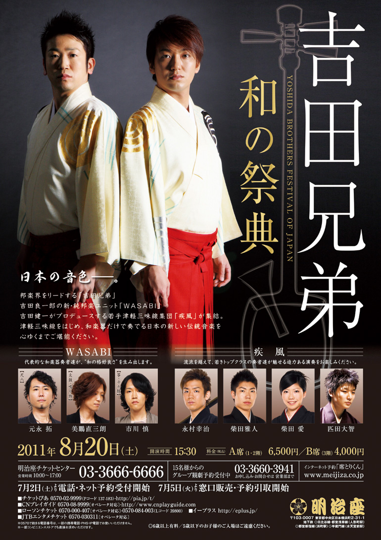 2011年8月公演 吉田兄弟 和の祭典 スタッフ・キャスト 出演: 吉田兄弟 WASABI 疾風 日本の音色―。 津軽三味線をはじめ、和楽器だけで奏でる日本の新しい伝統音楽を 心ゆくまでご堪能ください。