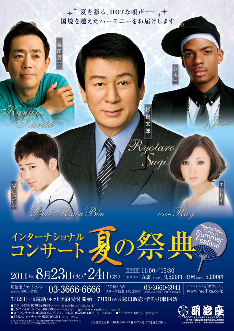 2011年8月公演 インターナショナルコンサート 夏の祭典 スタッフ・キャスト 出演: 杉 良太郎 栗田貫一 ジェロ エンレイ パク・ヒョンビン 夏を彩る、HOTな唄声―。 国境を越えたハーモニーをお届けします。